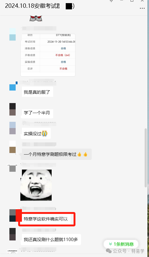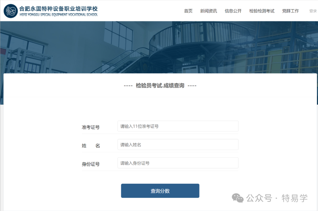 扫码关注我们公众号后: ①公众号首页发消息【激活码】 ②按要求操作,系统自动派发激活码 ③激活码可进入特易学刷题 使用 安徽电梯检验员成绩可以查询啦!喜报频传,祝贺大家。 2.成绩查询方法 还没查到成绩的同学可以复制下方网址进入查询网页 http://www.hefeiyg.com/index.php?app=home&mod=Queryscore&act=index 依次输入准考证号、姓名、身份证号,就能查到成绩啦! 祝大家都能欧气满满,成功上岸! 3.进入学习交流群 还没有进入学习群的同学可以扫描下方二维码添加小特微信,咨询加群。群里有老师、学长答疑解惑,还有同学相互交流。帮助大家复习备考。 检验员报名入口 北京丨天津丨浙江丨上海丨吉林丨重庆 海南丨辽宁丨山西丨贵州丨甘肃丨河南 云南丨宁夏丨福建丨安徽丨新疆丨四川 山东丨江苏丨河北丨湖南丨广西丨青海 江西丨湖北丨陕西丨广东 内蒙古丨黑龙江 扫码,加微信拉进群 老师乐于同大家交流报名、学习考试等相关问题 刷历年真题、观学习视频 2024 扫二维码|加我微信 进学习群|报名咨询|学习交流 了解软件|购买题集|正版书籍 打印资料|售后服务|………… 特易学APP和电脑PC端 系统全面学习 图文并茂学习 扫码安装APP或电脑PC端 应用市场/百度搜索“特易学” 企业招聘、个人求职 了解最新招聘行情 掌握最新求职动态 请联系松老师!