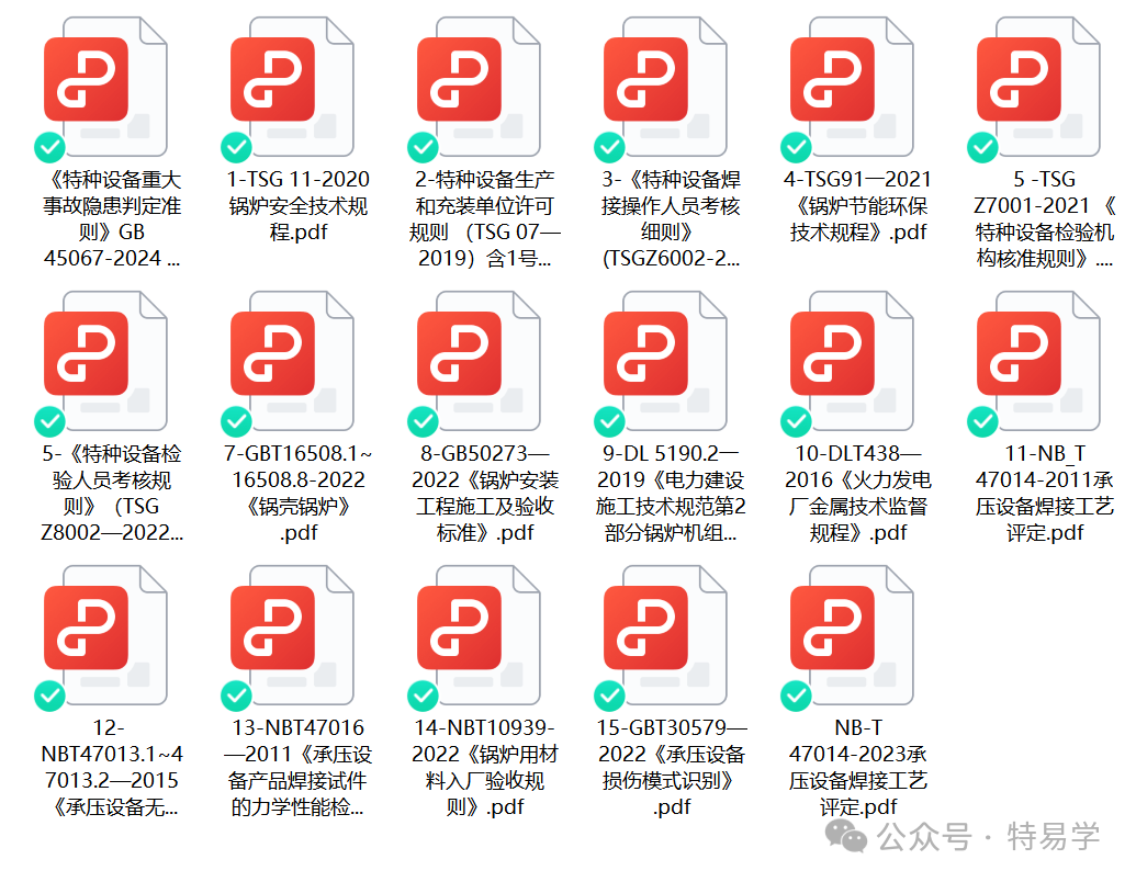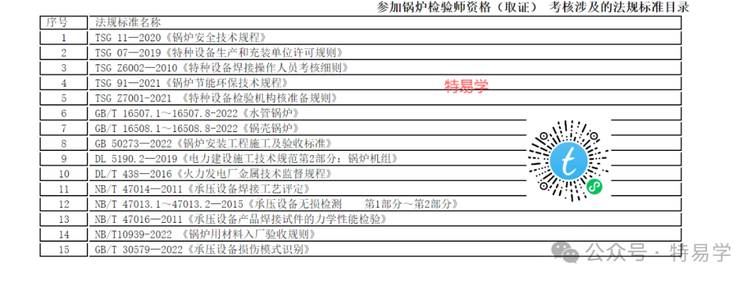 扫码关注我们公众号后: ①公众号首页发消息【激活码】 ②按要求操作,系统自动派发激活码 ③激活码可进入特易学刷题 使用 标准目录资料 参加锅炉检验师资格(取证)专业活动所需的法规标准目录如下: 以上图中标明了闭卷和开卷所涉及的开始范围和新检规内容。为了方便大家打印带入考场,特易学收集了电子版目录资料供大家下载打印。有需要的同学自行领取哦 领取方式 领取目录资料的方法很简单, 只需后台回复“锅炉师目录” 即可打包下载哦 希望大家都能顺利通过考试,取得理想的成绩! 报名入口 各省报名入口由此进入 进学习群 可扫描下方二维码添加微信咨询拉进群 群里有老师、学长答疑解惑、持续互动 扫码,加微信拉进群 老师乐于同大家交流报名、学习考试等相关问题 刷历年真题、观学习视频 2024 扫二维码|加我微信 进学习群|报名咨询|学习交流 了解软件|购买题集|正版书籍 打印资料|售后服务|………… 特易学APP和电脑PC端 系统全面学习 图文并茂学习 扫码安装APP或电脑PC端 应用市场/百度搜索“特易学” 企业招聘、个人求职 了解最新招聘行情 掌握最新求职动态 请联系松老师!